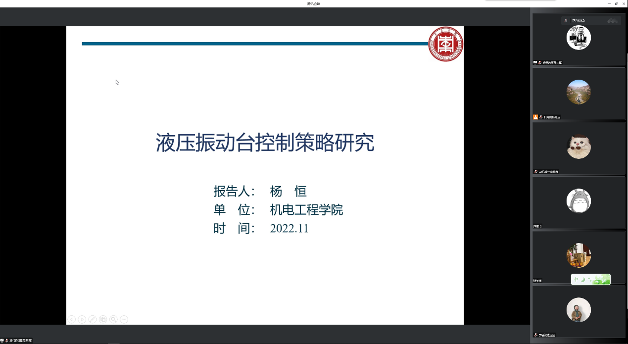 杨恒博士做了题为“液压振动台控制策略研究”的报告。报告首先介绍了振动和液压振动台控制的研究背景和现状,然后陈述了多种液压振动台的设计档案和优缺点,其次阐述了液压振动台建模及伺服控制技术,最后重点介绍了液压振动台的振动控制。