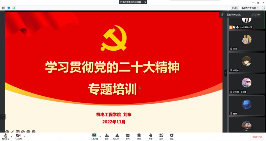 为深入学习贯彻党的二十大精神,落实习近平总书记关于青年工作的重要论述,充分发挥“青马工程”学员在学习宣传贯彻党的二十大精神中的示范引领作用,11月16日下午,beat365官方网站开展学习贯彻党的二十大精神专题培训暨“青马工程”培训理论课。此次培训以线上形式展开,团总支书记刘东领学解读党的二十大报告,班级团干部、学生会干部和社团骨干等近200名团学干部参加本次培训。