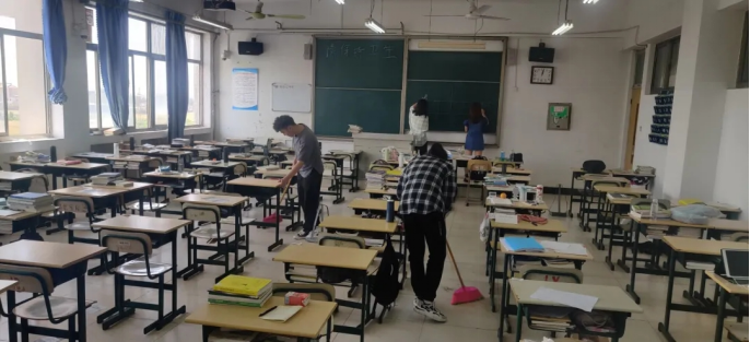 清洁工作开始前,卫生部召开工作会议,首先强调了安全问题,其次进行工作分配,分区域负责,并强调对一些墙角、门窗玻璃等清洁较困难位置着重清理。在清洁过程中,卫生部全体成员秉承严肃认真的原则,对地面、桌椅等部位进行仔细清洁,对门窗玻璃、墙角等顽固位置,进行反复清理,有安全隐患的位置进行记录并上报,请专业人员帮助清理。清洁完毕后,卫生部与宣传部在考研教室黑板上,书写鼓励师哥师姐考研的打字。最后,对考研教室进行了消毒处理,保证教室空气环境清新洁净。