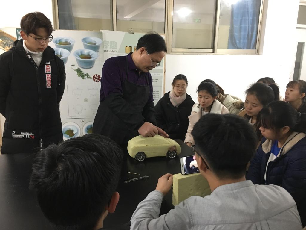 交流期间,首先由王谷天老师通过《工业设计的产业价值与面向》的专题讲座,从企业角度分析了当下对高校毕业生专业素质的综合要求,并分享了工业设计师的就业方向以及学生应掌握的设计技能。然后由陈岩师傅针对《模型设计与制作》课程,以汽车设计为例通过实际操作向学生们演示了油泥模型的制作方法、规范和技术标准。最后,在两位老师的指导下,学生分组实操制作油泥模型,通过动手能力训练与交流指导,激发了学生的创意思维意识,提升了学生的模型造型设计技术能力。