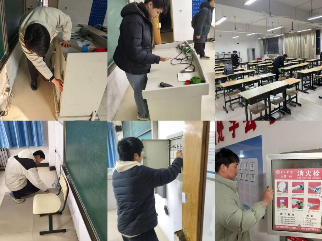 检查小组按照分工,重点对教室插排线路、消防器材、多媒体设备、门窗桌椅及应急通道等关键区域展开检查,认真记录电线老化、器材过期、设施损坏等潜在安全隐患。对于能现场整改的问题,检查人员立即协调处理,对于需专业维修的隐患,记录隐患位置,具体情况上报学院相关部门,确保每一个隐患都能得到彻底解决。