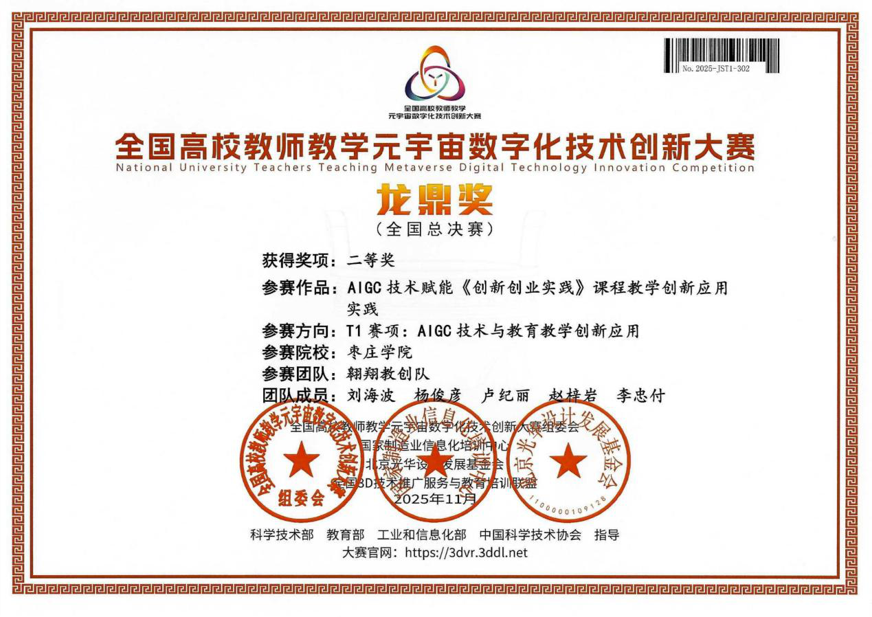 近日,2025年第6届全国高校教师教学元宇宙数字化技术创新大赛全国总决赛圆满落幕。beat365官网beat365官方网站由刘海波、杨俊彦等教师组成的教学团队,凭借《AIGC技术赋能创新创业实践课程教学创新应用》成果,在T1赛项“AIGC技术与教育教学创新应用”赛道中表现突出,荣获全国总决赛二等奖。
