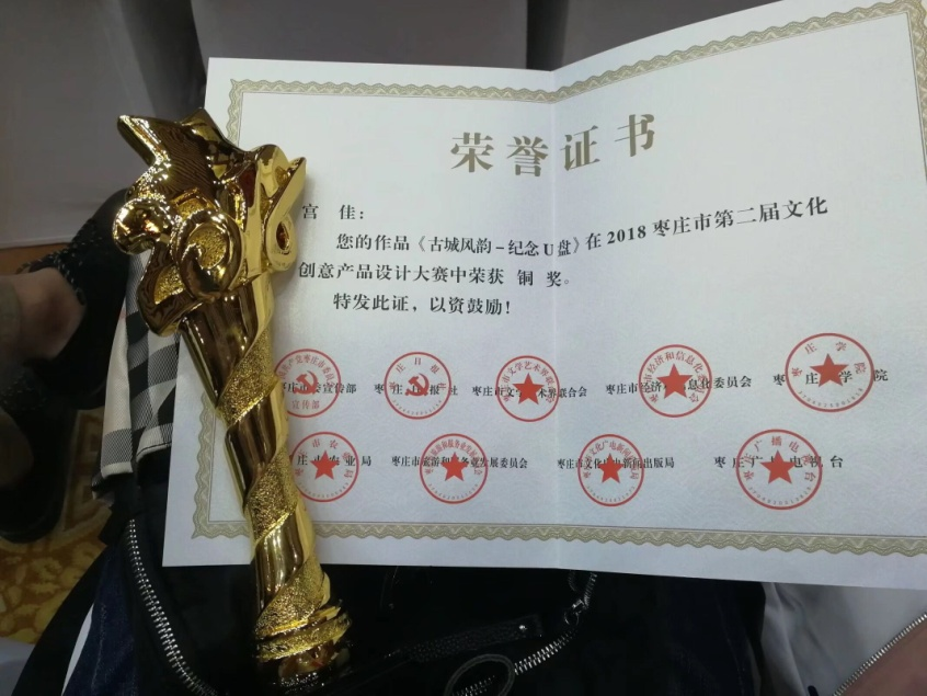 近日,在枣庄市举办的第二届文化创意产品设计大赛中,beat365官方网站2017级工业设计专业学生宫佳作品《古城风韵—纪念U盘》取得创意类铜奖,于10月27日在枣庄市台儿庄古城兰祺会馆举行颁奖典礼。