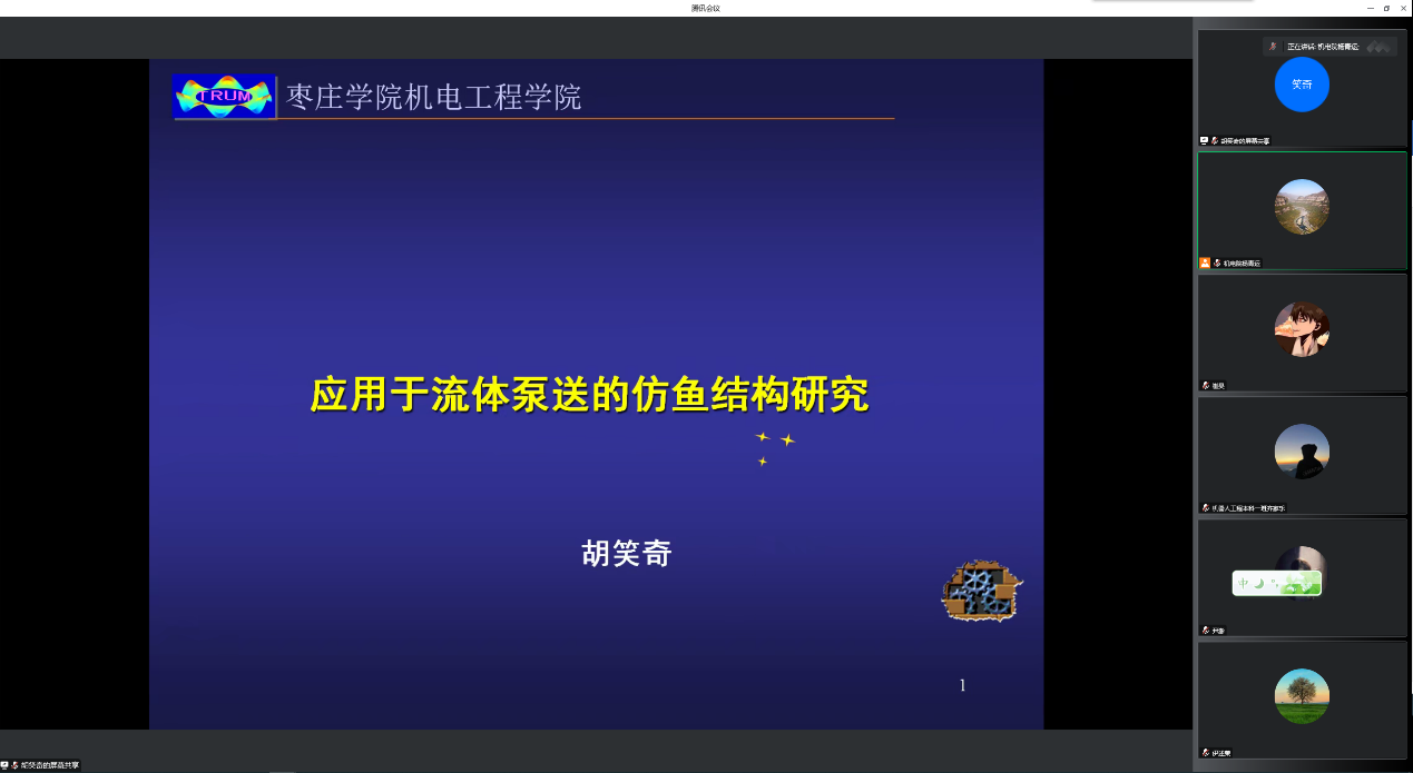 胡笑奇老师做了题为“应用于流体泵送的仿鱼结构研究”的报告。报告首先介绍了流体泵的分类和研究背景,然后陈述了仿鱼结构推进机理的现有理论假说以及刚体结构摆动的附着流体的离心力效应,其次展示了摆动振子的动力学模型,最后重点介绍了尾鳍形状优化和应用领域及未来展望。