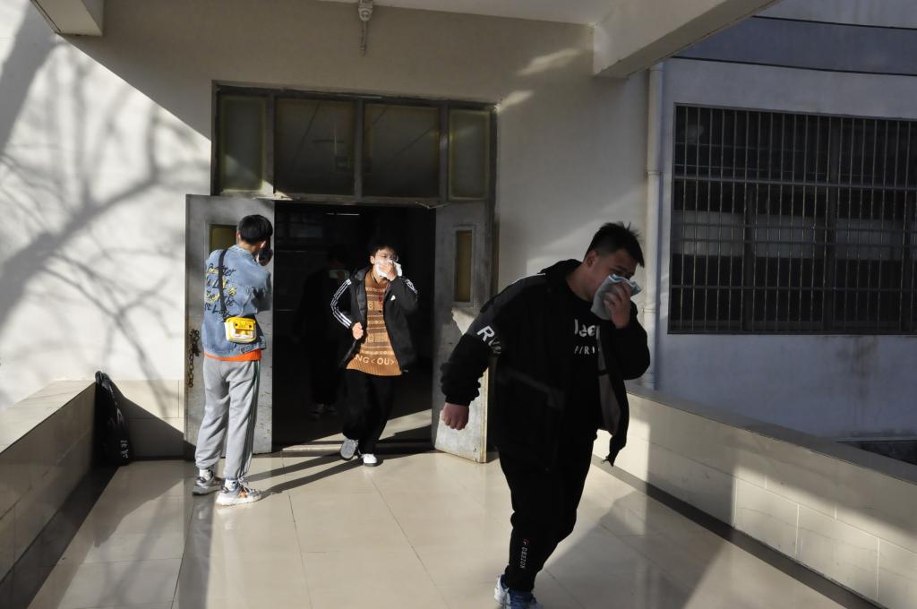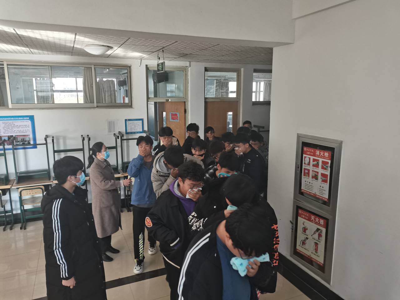 15时,随着刺耳的消防警报,理工教学楼四楼烟雾弥漫,面对突如其来的“火”警,全体师生按照消防演练预案迅速行动,各楼层安全员及相关组织人员立即到达指定岗位,做好疏散准备。各班学生在辅导员的带领下,按照疏散线路有序撤离,大家用湿毛(湿手帕)捂住口鼻、弯腰、低姿、小碎步,动作规范、迅速地向指定地点集合,各班清点并上报人数,顺利完成疏散演练。