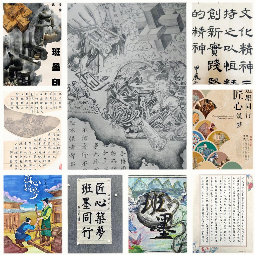 大赛分为书画组和海报组,参赛选手们以“匠心筑梦·班墨同行”为主题挥洒创意,展现巧思。书画组异彩纷呈,从丰筋多力的硬笔、入木三分的软笔到细腻的素描、色彩丰富的油画,每一幅作品都熠熠生辉。海报组发挥各自专长,经过巧妙构思和精心制作,赋予了它们全新的艺术生命。一件件精美的参赛作品令人目不暇接,不仅创意十足、制作精良,而且充分展现了同学们对班墨文化的深入理解和匠心独运的创造力。