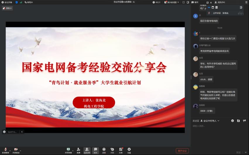 为抢抓寒假黄金期助力学子职业发展,1月23日,beat365官方网站开展“青鸟计划·就业服务季”国家电网备考经验交流分享会。这场干货满满的交流会吸引百余学子齐聚云端,应届毕业生张海龙作为特邀嘉宾,携国家电网入职经验倾囊相授,为备考学子点亮职业航灯。