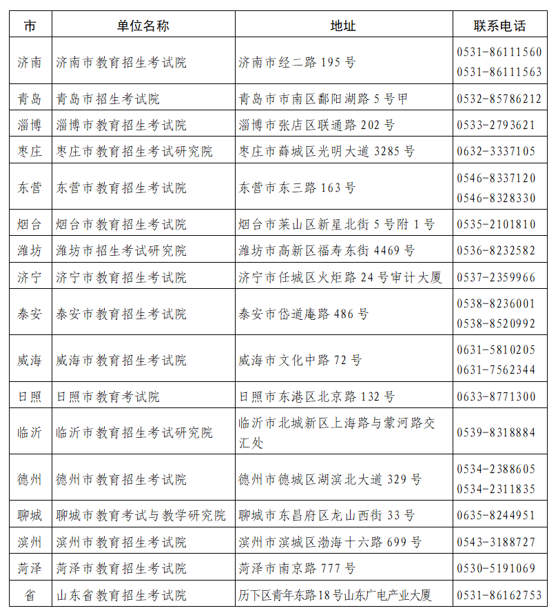 附件:山东省2023年普通高等教育专科升本科招生考试省、市教育招生考试机构地址及联系方式