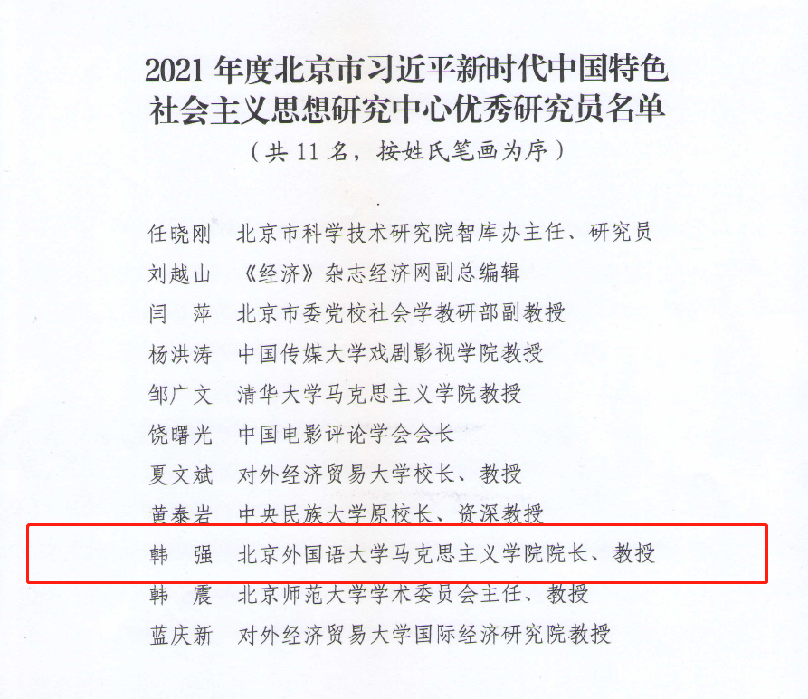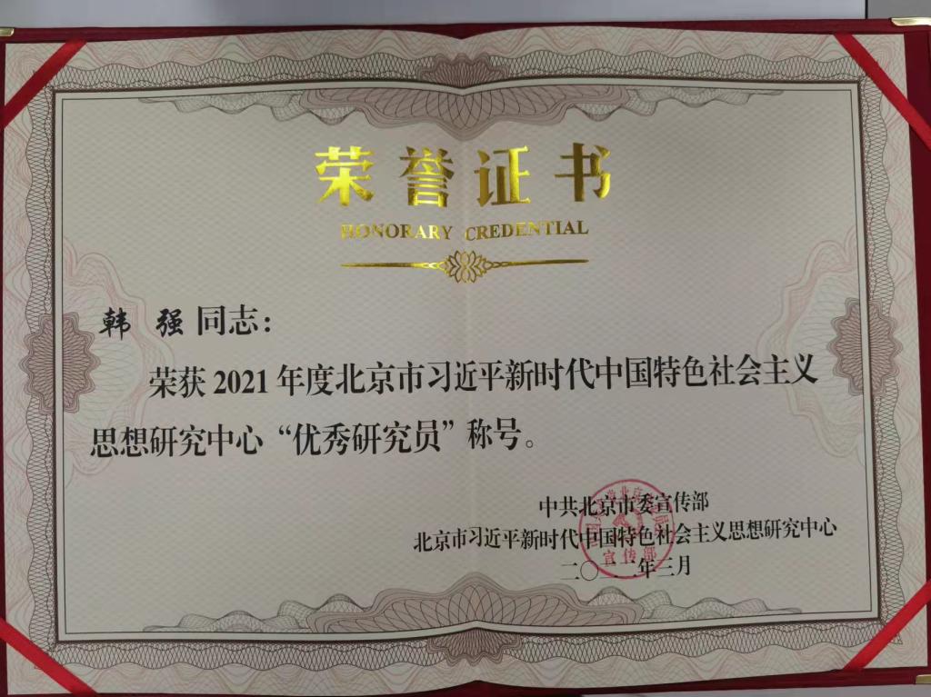 kaiyun官网韩强教授获评2021年度北京市习近平新时代中国特色社会主义思想研究中心优秀研究员
