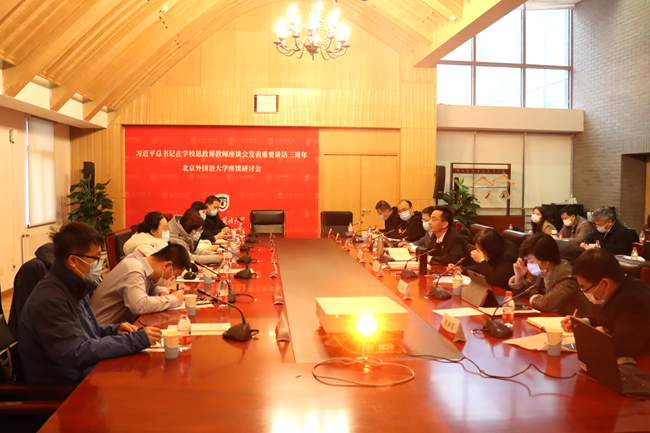 在第二阶段的发言研讨环节,思政课教师王成诚结合《中国近现代史纲要》课程分享了批判错误思潮、抵制历史虚无主义的重要意义;赫雪结合《马克思主义基本原理》课程分享了开展具有鲜明外语特色实践教学项目的有效经验;英语学院教师王颖冲结合翻译课程介绍了在专业课程中融入思政元素对于文化软实力建设和国家形象构建的重要意义;专用英语学院教师张东英结合专用英语教学经历分享了显性教育和隐性教育相结合的重要性。