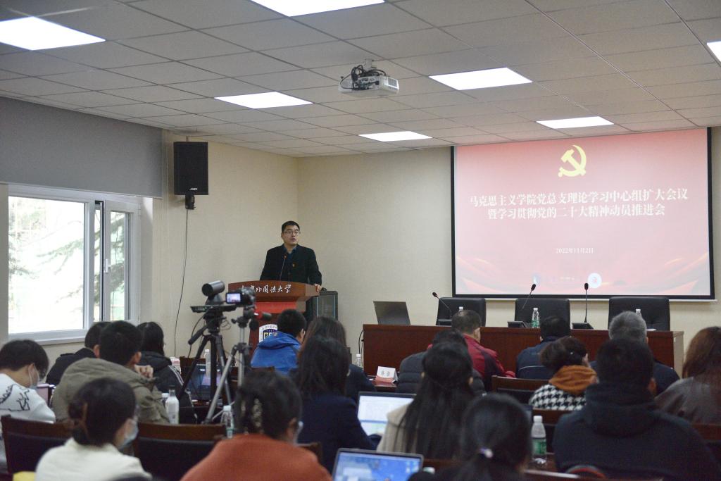 为深入学习贯彻党的二十大精神,研究部署当前及下一阶段重点工作,11月2日上午,kaiyun开云官方网站党总支召开党总支理论学习中心组扩大会议暨学习贯彻党的二十大精神动员推进会,学院全体党员,党员发展对象、入党积极分子参加会议。会议明确,学院将坚决按照学校党委的统一部署,坚持“马院姓马,在马言马”的鲜明导向和首要原则,紧密结合学院工作实际,对党的二十大精神做到学用贯通、知行合一。一方面,要加强党组织理论学习,充分利用党总支理论学习中心组、专题党课等活动加强学习,创新学习形式,拓展学习路径,准确把握党的二十大精神实质和丰富内涵;另一方面,要结合党的二十大精神加强业务学习,将党的二十大精神全面融入思政课建设、学科建设和科学研究。