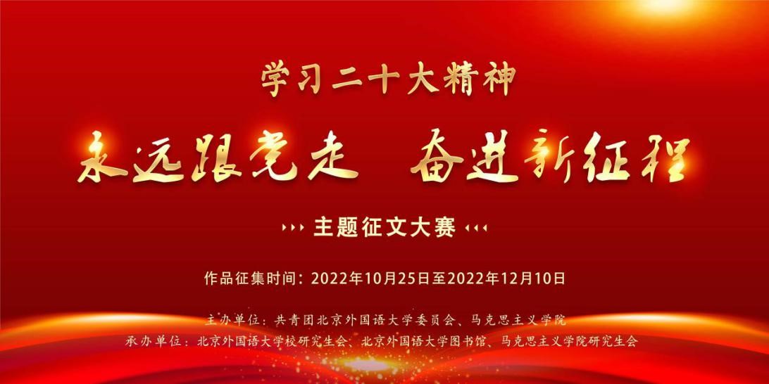青春心向党,奋进新征程。为深入学习贯彻党的二十大重要讲话精神,进一步深化思想政治引领,引领北外学子坚定不移听党话、跟党走,努力成为有家国情怀、有全球视野、有专业本领的复合型人才,kaiyun官网联合校团委共同举办“学习二十大精神·永远跟党走、奋进新征程”主题征文大赛,促进学生通过生动的语言文字表达对党的深厚情感、讴歌新时代取得的辉煌成就,充分展现kaiyun官网学子善学习、找方向、勇担当的精神风貌,推动二十大精神学习交流。
