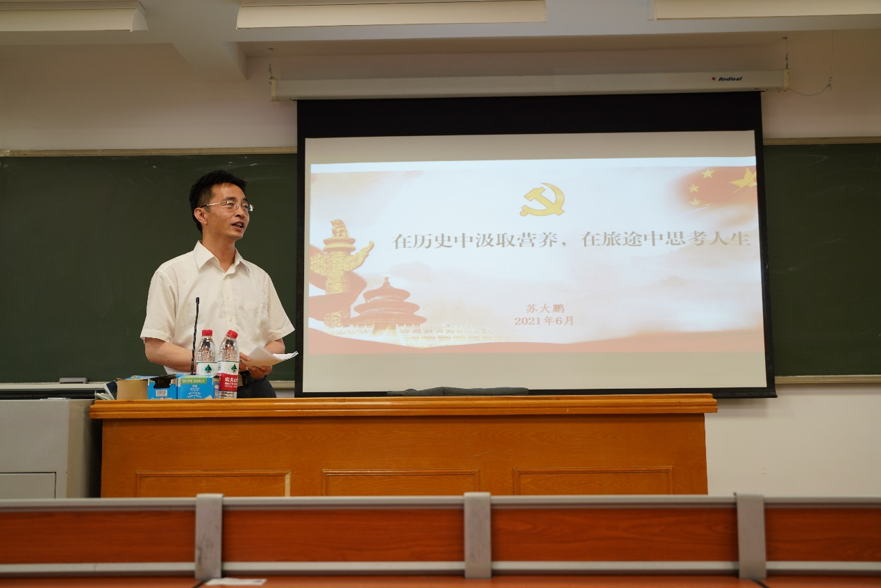 6月12日下午,校党委副书记苏大鹏在《形势与政策》课堂,以党史教育为主题,结合当前形势政策,为本科生上了一堂题为“在历史中汲取营养,在旅途中思考人生”的党课。