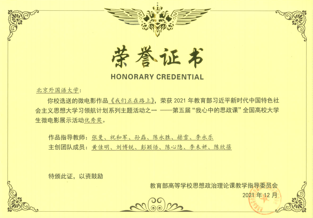 kaiyun官网张曼、祝和军、孙磊、陈永胜、赫雪、李永乐教师团队指导的微电影《我们正在路上》在教育部高等学校思想政治理论课教学指导委员会主办的第五届“我心中的思政课”全国高校大学生微电影展示活动中荣获优秀奖。