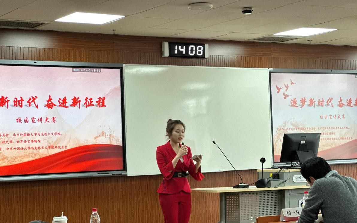 黄伦伦老师为比赛致辞。他希望北外学子不仅要理解中国,读懂中国,更要能够讲好新时代伟大变革的中国故事。时代青年要立足专业特色,传递奋进力量,作读懂中国的“主角”、讲述中国的“主力”、感悟中国的“主体”,在理论学习与实践锻炼中涵养家国情怀、开拓全球视野、提升专业本领。