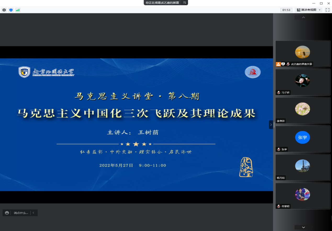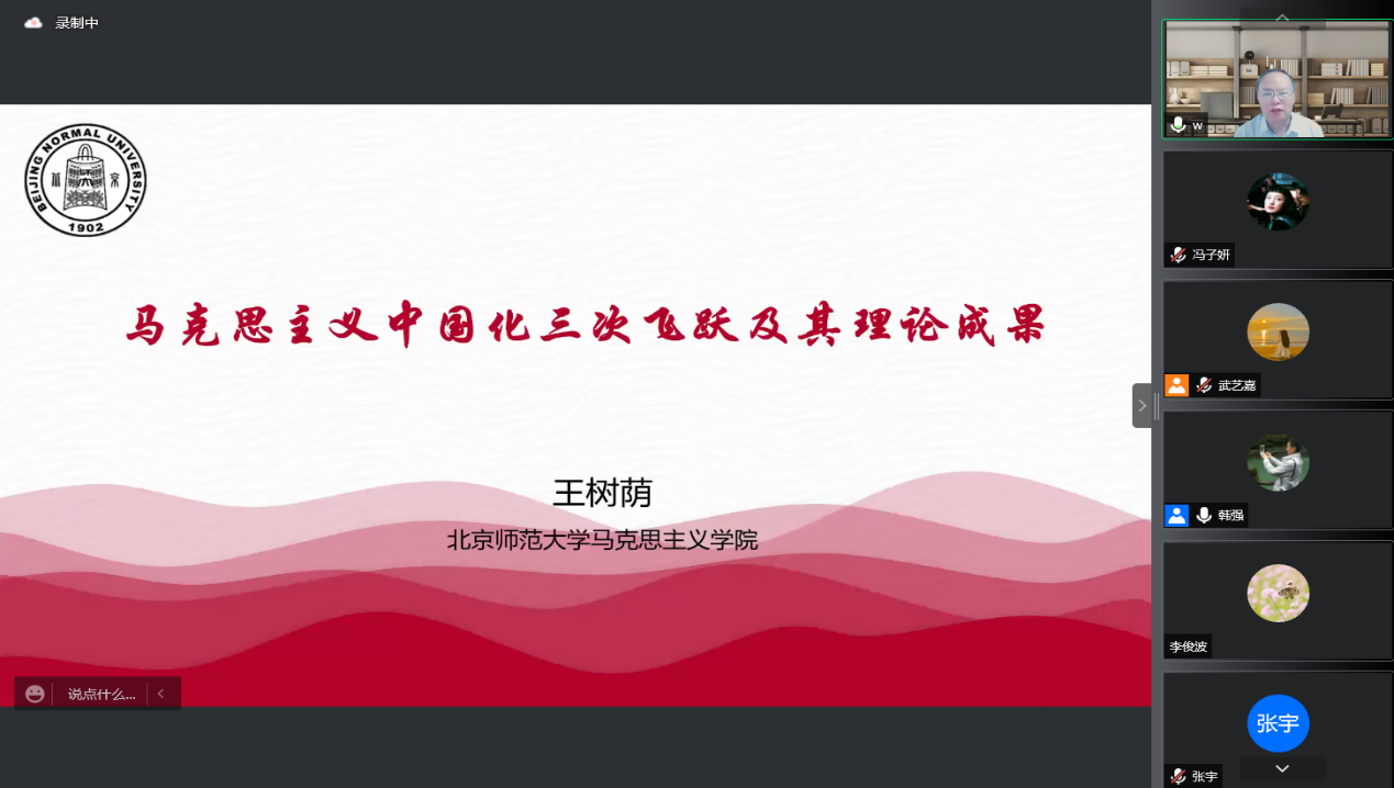 5月27日上午,北外马克思主义讲堂第八期活动在线上成功举办。北京师范大学kaiyun开云官方网站二级教授、博士生导师王树荫应邀以“马克思主义中国化三次飞跃及其理论成果”为题做了专题讲座。本次讲座共有校内外师生500余人参加,活动由kaiyun开云官方网站院长韩强主持。