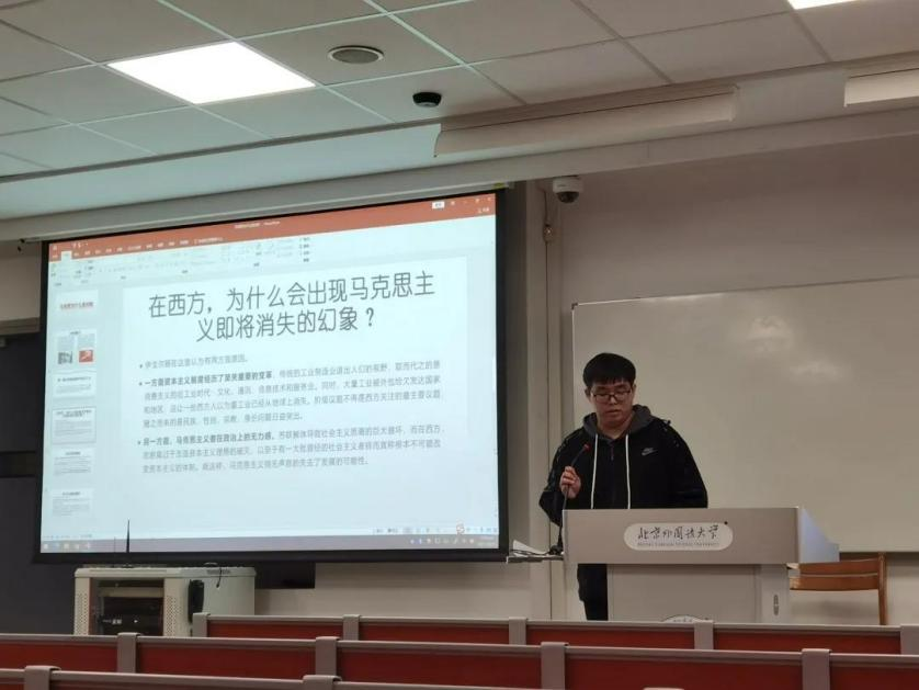 第一位分享的是2021级崔凡页同学,她分别从“马克思主义的实现是马克思主义的消失”、“只要资本主义存在,马克思主义就不会终结”以及“马克思所预测的资本主义将会遇到的问题正在现今上演”三方面反驳“马克思主义终结论”。对于“马克思主义实践有害论”的观点,她分别从“资本主义的发展正是建立在血腥上”、“社会主义发展中的危害很大程度来自于西方社会”、“苏联社会主义模式的失败绝不是社会主义的失败”三个方面为马克思主义辩护。为了进一步厘清书中涉及的理论问题,她摘录了马克思的博士论文对“哲学的消亡就是哲学的实现”作了深入地阐释,指出其对于我国建设中国特色社会主义社会的积极启示。