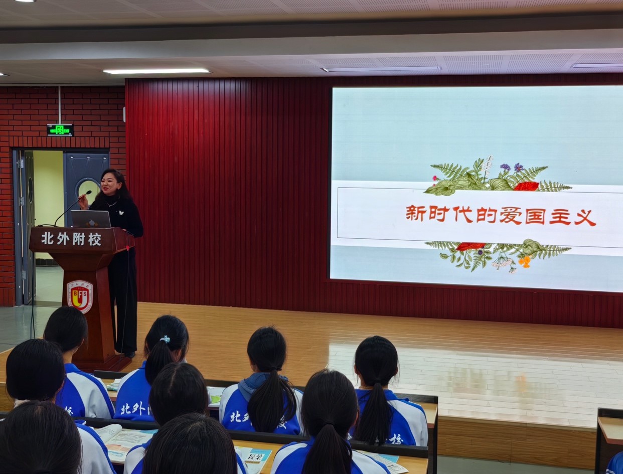 为贯彻落实党的二十大关于 “用社会主义核心价值观铸魂育人,完善思想政治工作体系,推进大中小学思想政治教育一体化建设”的精神,kaiyun官网kaiyun开云官方网站教师刘菁于2023年11月9日下午,赴kaiyun开云官方网站附属外国语学校,与附校高中德育处、思政教学一体化课题组联合举办了一场主体为“新时代爱国主义”的讲座。