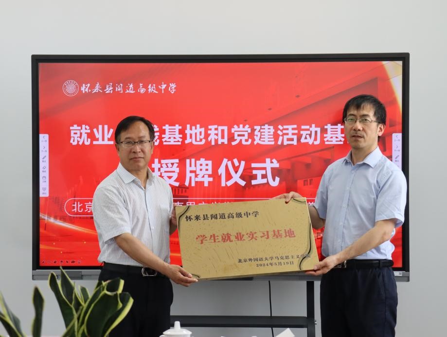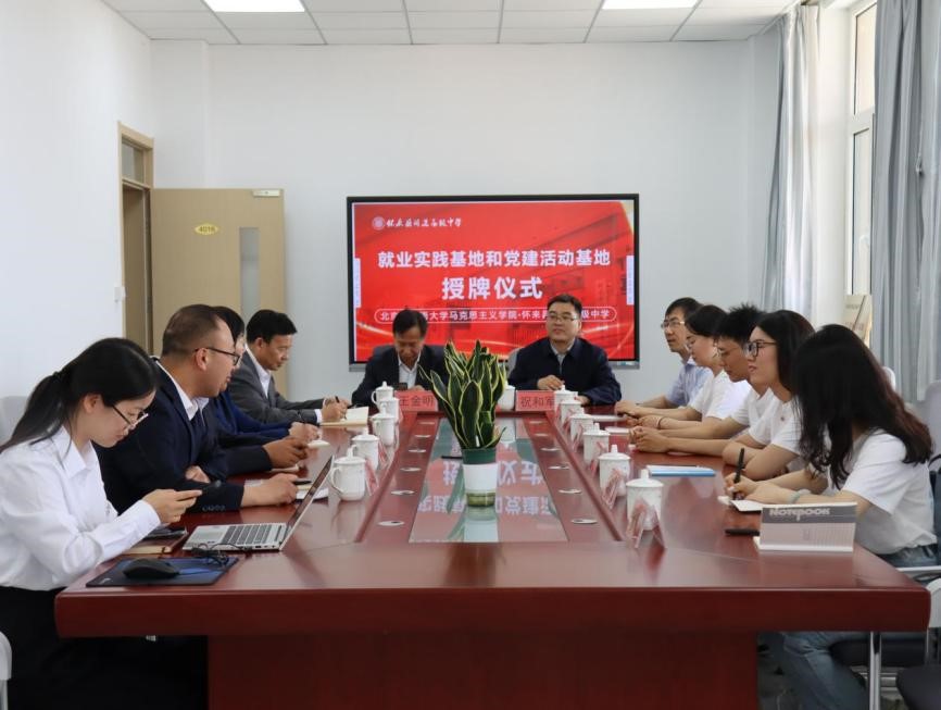 怀来闻道高级中学校长王金明首先向北外kaiyun开云官方网站一行的到来表示欢迎和感谢。他首先介绍了中学的办学宗旨、办学理念,在校学生规模和学校的发展目标,并介绍了两个单位定期联合开展思政教育、分享育人经验以及开展党建工作的有关计划。他指出,要以这次“学生就业实习基地”和“党建活动基地”的授牌为契机,欢迎北外马院学生来高中进行就业实习,将自己所学知识转化为授课本领,实现双向提高。王金明还介绍了学校党建和思政工作的开展情况,并指出,怀来具有丰富的革命文化教育资源,新保安战役纪念馆、董存瑞纪念馆都坐落在怀来,两个单位要充分发挥利用好这些资源,创新形式,开展大思政课实践教学,助推学生成长成才。