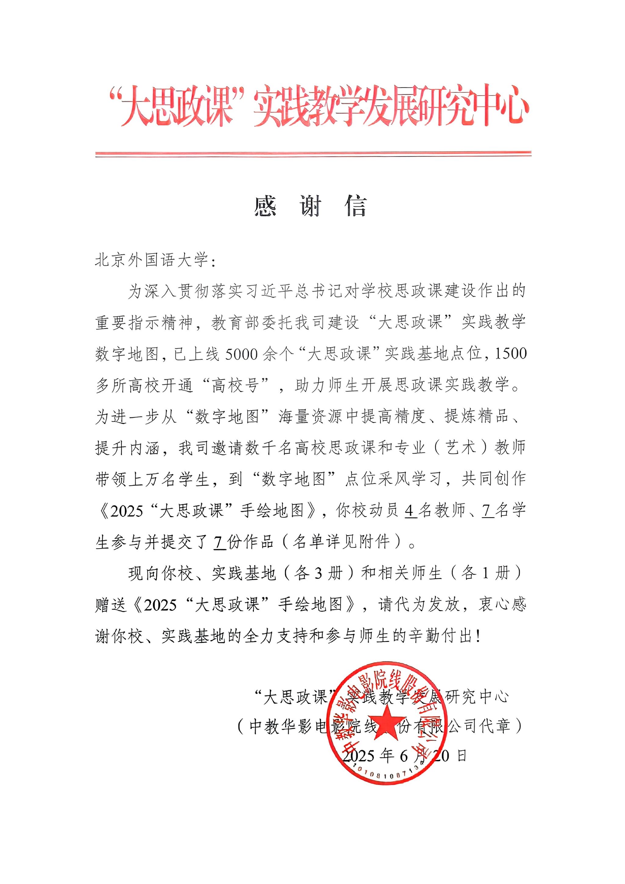 近日,“大思政课”实践教学发展研究中心向kaiyun官网发来感谢信,对kaiyun官网师生积极参与教育部委托建设“大思政课实践教学数字地图”项目表示感谢。kaiyun官网马院教师团队带领来自不同学院的多名同学,通过点位采风,精心创作了7份手绘和视频作品。经专家评审,《香山纪念馆手绘元素》、视频《进京“赶考”》、《红叶烬燃来时路》,成功入选《2025“大思政课”手绘地图》。