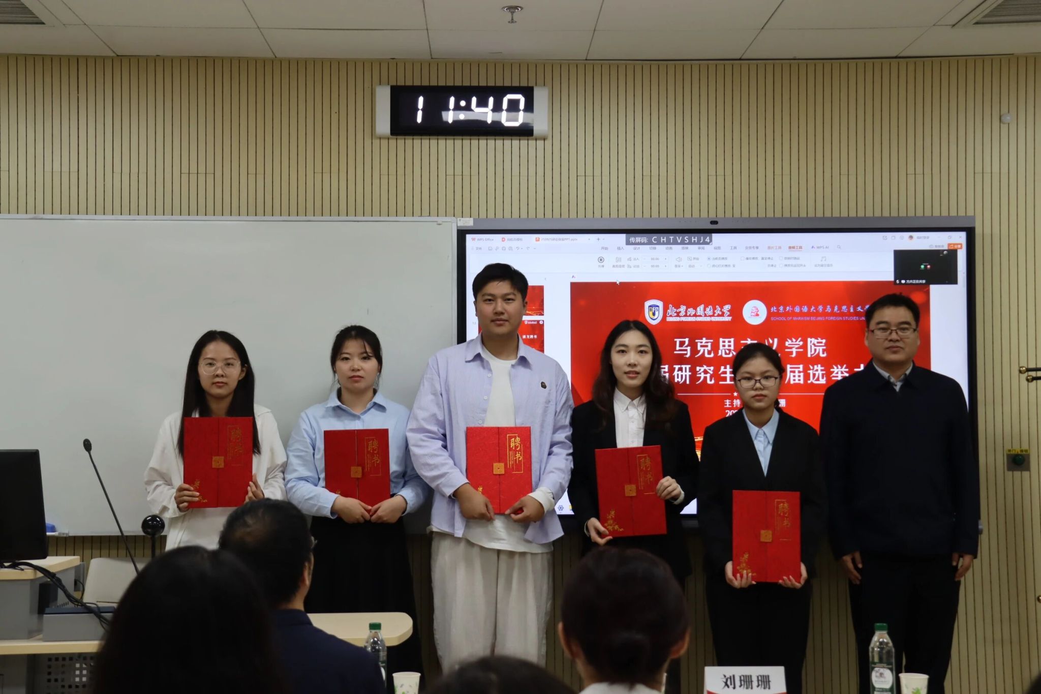 祝和军为新一届研究生会成员颁发聘书,与会师生合影留念。